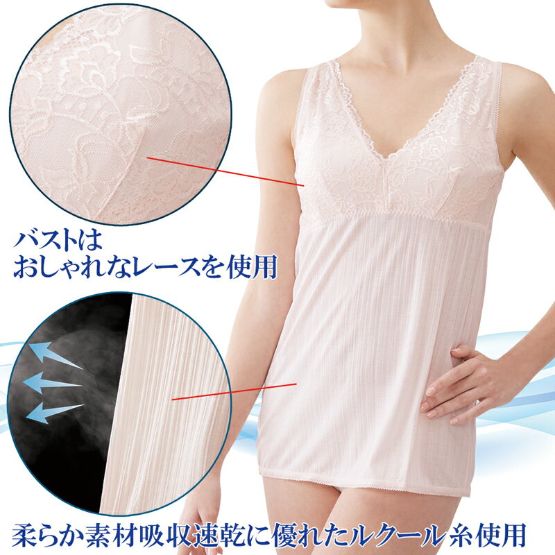 速乾 吸水 吸汗 速乾 ソフトカップ ブラインナー キャミソール タンクトップ ノンワイヤー ノンホック レース インナー カップ付き 女 女性 おすすめ 40代 50代 60代 吸水性と速乾性をあわせ持つしなやかな糸「ルクール」を使用。
