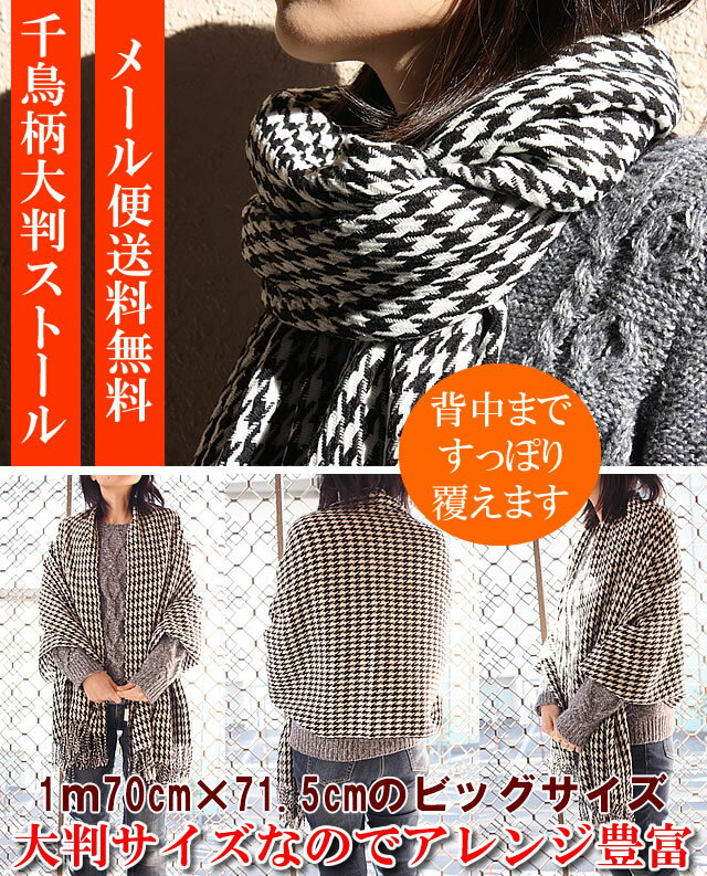 【メール便送料無料】千鳥格子大判ストールチェック マフラー レディース 女性用 秋冬 ストール 冷房対策 防寒 白 黒 ブラウン ベージュ ラメ アクリル 12410010 大きい 大きめ 冬用 秋用