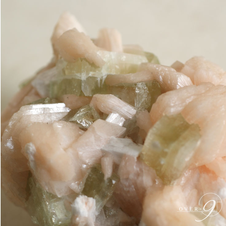 アポフィライト & スティルバイト アポフィライトとは、ギリシャ語の「葉のように簡単に剥がれる」という由来から硬度は4ほどで非常にもろい鉱物ですが、水晶とは違う幻想的な輝きがあります。