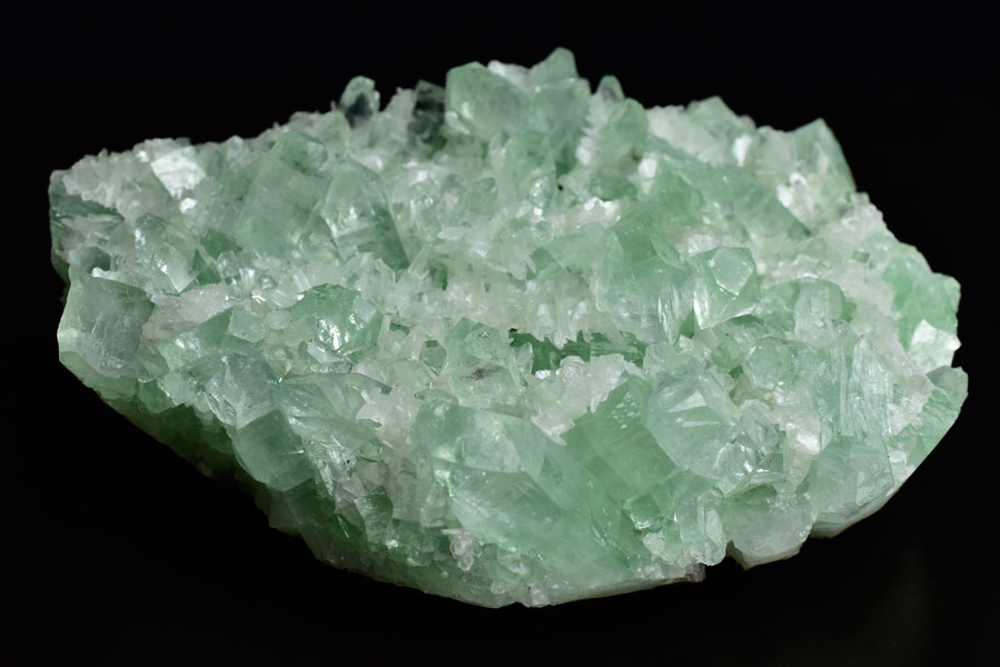 アポフィライトは、柱状や正方錘状の結晶を持ち、ひとつひとつの結晶が複雑に入り組んだ群晶が水晶とは違う神々しい輝きを魅せてくれます。