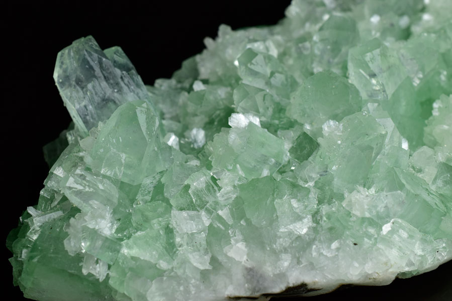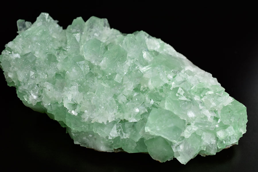アポフィライトは、柱状や正方錘状の結晶を持ち、ひとつひとつの結晶が複雑に入り組んだ群晶が水晶とは違う神々しい輝きを魅せてくれます。
