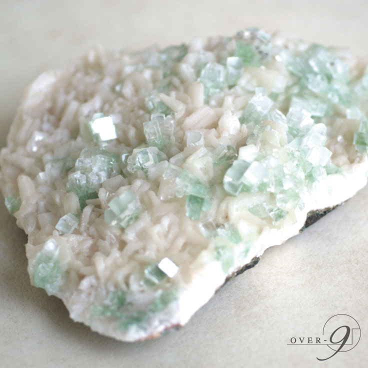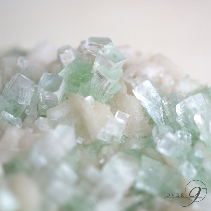 アポフィライトを様々な角度から見るとレインボーやまるでパステルカラーのエメラルドのようなクリアな透明感がたまりません。