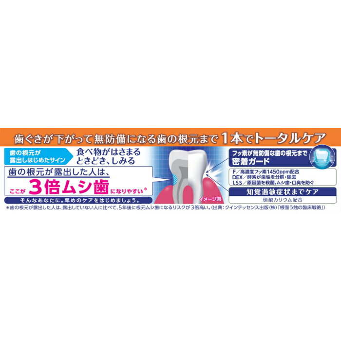 (出典:クインテッセンス出版(株)「根面う蝕の臨床戦略」) 洗練された爽やかなクリアシトラスミントの香味 低発砲ジェルペーストだからじっくりみがけます ペースト色:ライトグリーン